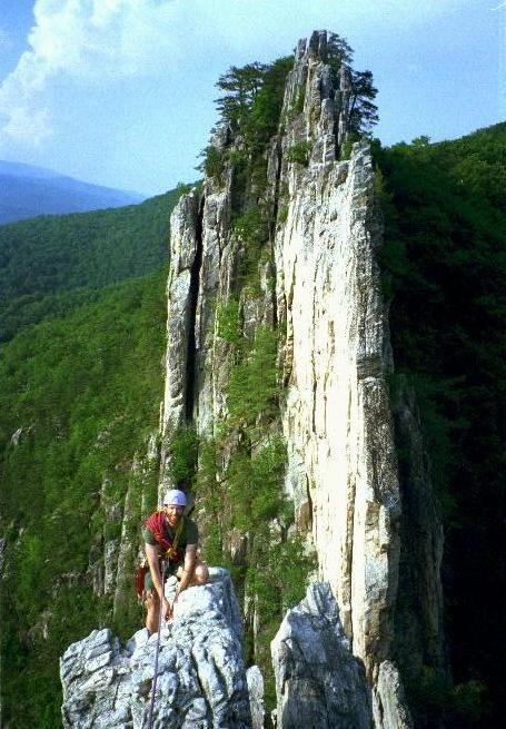 Cleaning pro on "Gunsight to South Peak"; an easy (5.3), fun route at Seneca Rocks, West Virginia. 6/8/96