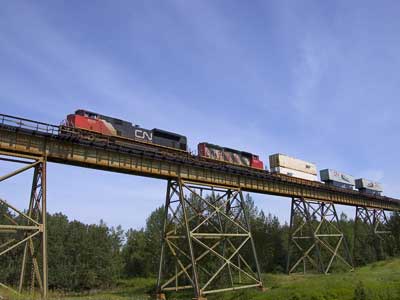 | Driving West from Edmonton, I passed this Westbound stack train accelerating from a meet. I pulled ahead and quite fortunately found this bridge. Near Entwistle, AB |