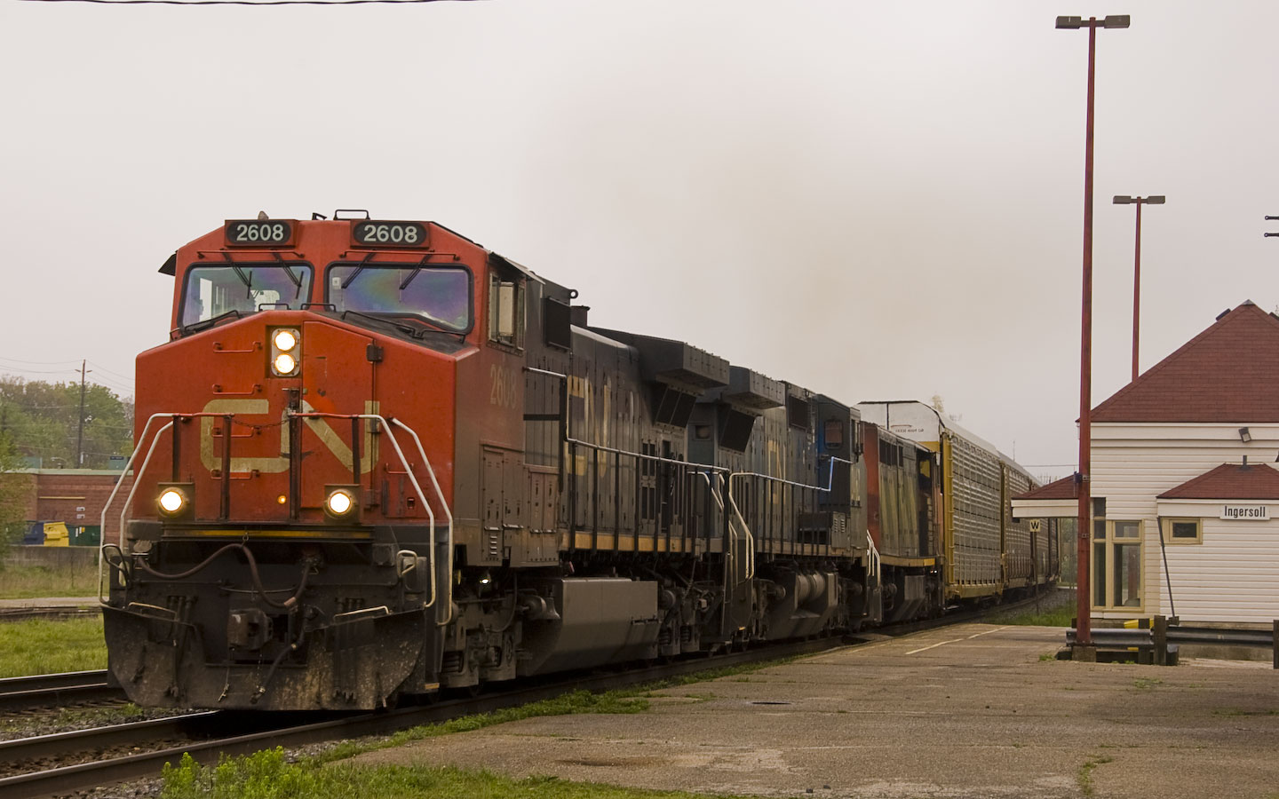 | This Eastbound freight is approaching the station at Ingersoll, Ontario at milepost 59.0 on the CN Dundas subdivision. 9:51am |
