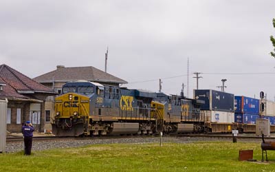 | Wednesday, May 2nd was a travel day, but we managed a stop at Fostoria at the site of the proposed railfan park. Eastbound roadrailer toward the C&O diamond and Blair Yard. Fostoria, Ohio 9:57am |